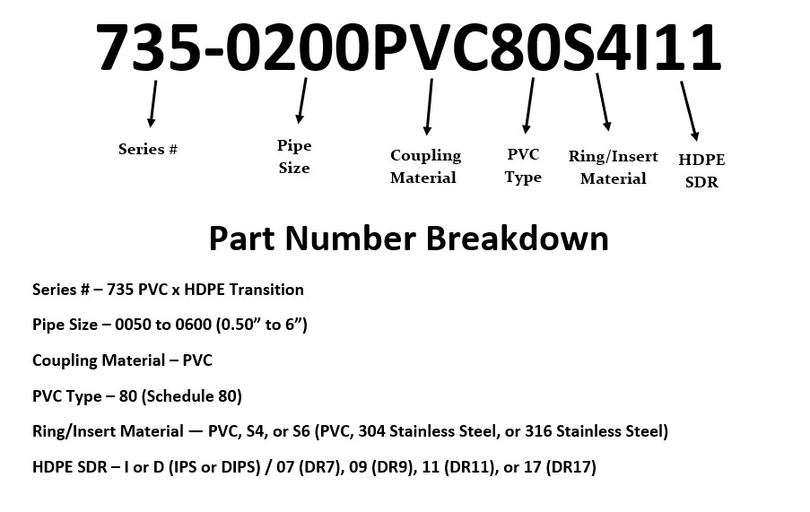 The transition fitting is constructed out of PVC material, stainless steel insert, and high density polyethylene (HDPE) pipe. The PVC and HDPE materials are joined together by hydraulically pressing the HDPE pipe into the PVC coupling. The PVC coupling portion of the transition fitting is machined with our multi-level barb system that provides a leak-free radial compressed joint. The HDPE portion of the transition fitting is cut to a specific length and is pressed into the PVC coupling. A stainless steel insert is installed to lock the PVC coupling and HDPE pipe together thus forming a leak-proof joint.